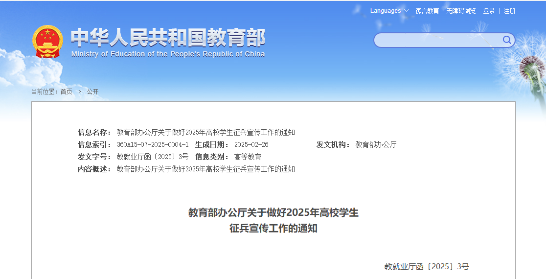 教育部办公厅关于做好2025年高校学生征兵宣传工作的通知